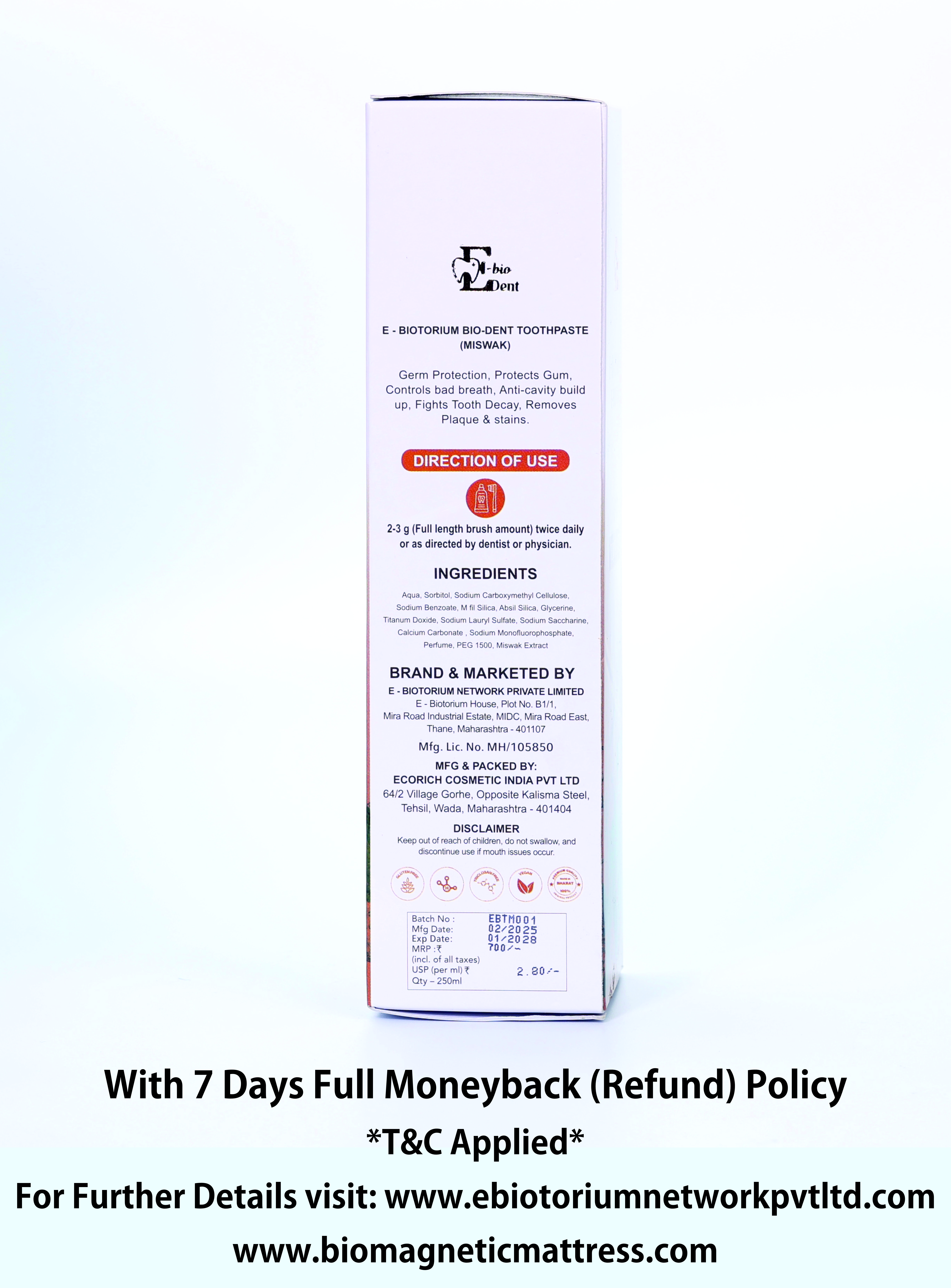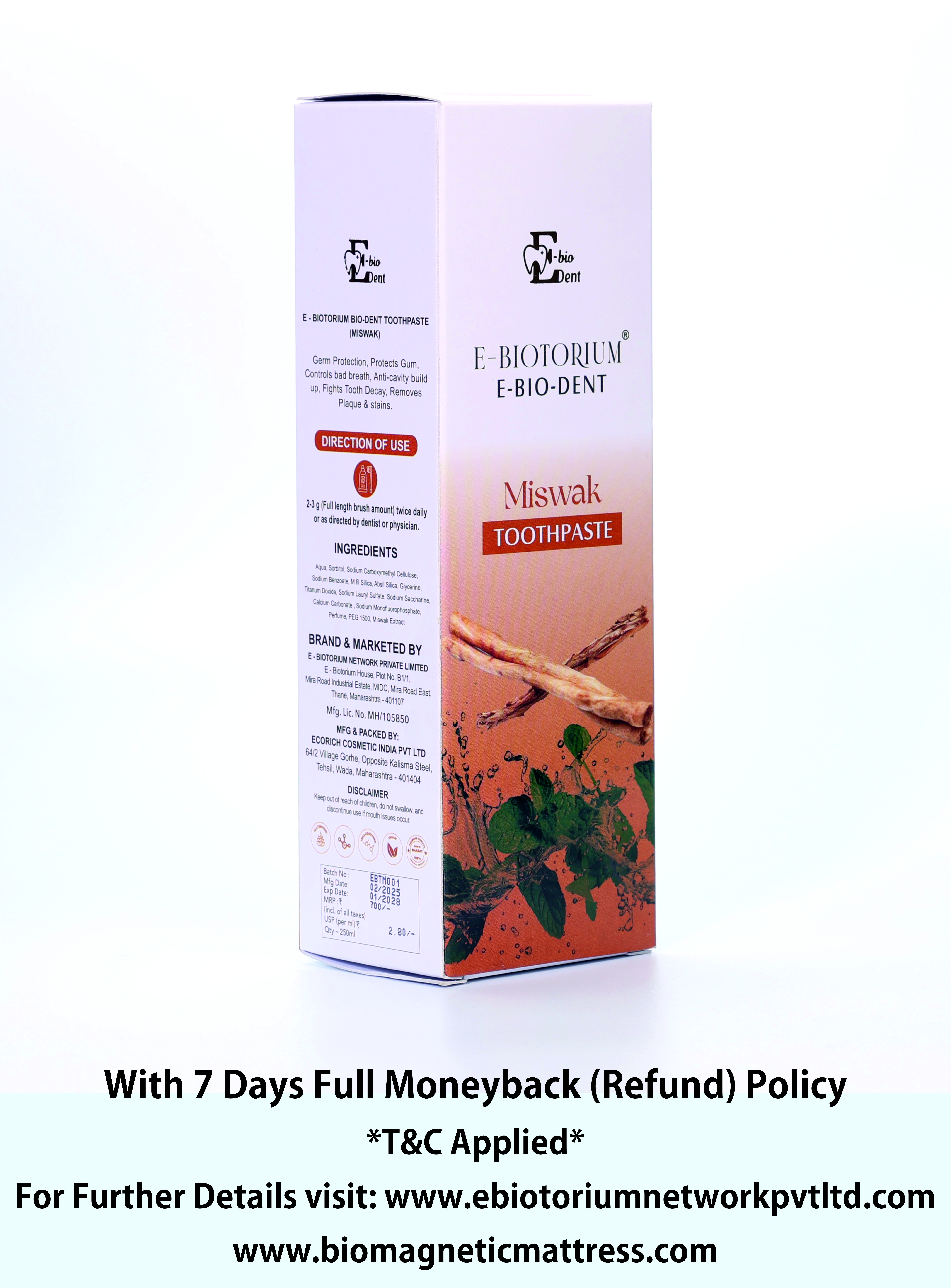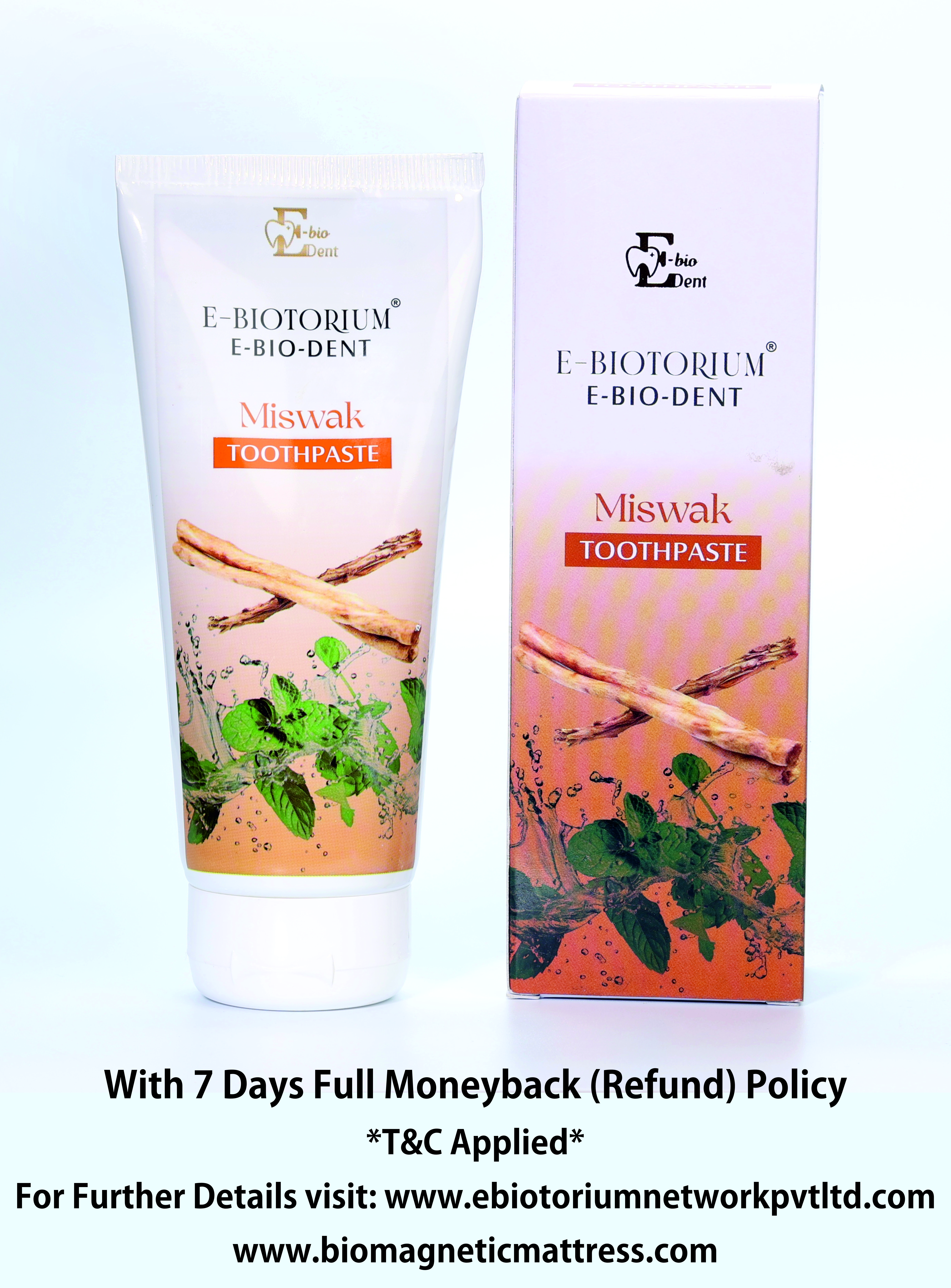E-Bio-Dent Miswak Toothpaste is crafted with the natural essence of Miswak (Salvadora persica), traditionally known for its oral care benefits. The toothpaste is formulated to deliver freshness and cleanliness with every use. Packed in a convenient tube, it is suitable for daily brushing and maintaining oral hygiene.